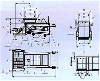 標注:1.減速機 2.電動機 3.傳動平臺 4.聯(lián)軸器 5.H形架 6.連桿 7.給煤槽 8.閘門 9.機架 10.漏斗 11.托輥